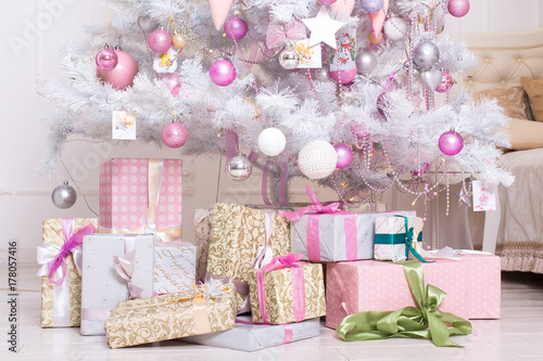 Giftboxes Pink And White Christmas Decorations Balls Hanging On A Decorative White Christmas Tree Stock Photo Adobe Stock