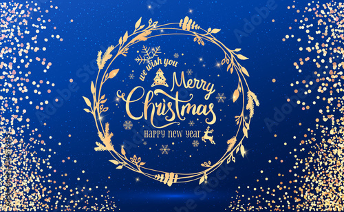 Gold Christmas And New Year Typographical On Blue Holiday Background With Christmas Wreath Gold Firework Light Stars Xmas Card Vector Illustration Stock Vector Adobe Stock